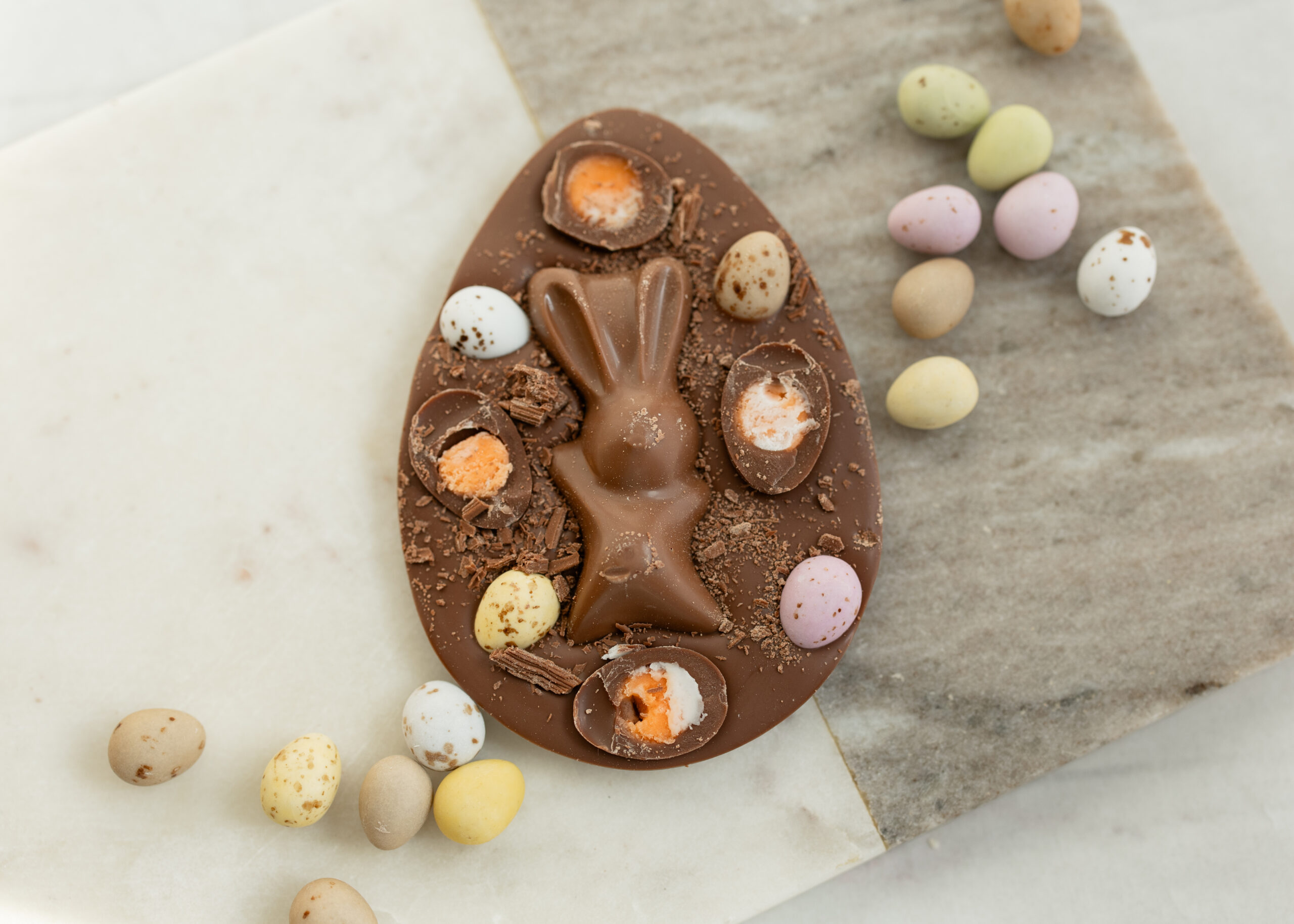 Flat Easter Egg covered with a Maltesers bunny, mini eggs, mini creme eggs and chocolate flakes.
